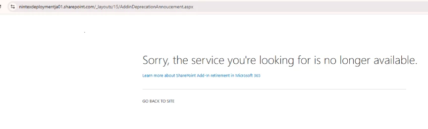 Clicking the Nintex Workflow or Nintex Forms Add‑In will show a generic Microsoft message indicating the service is no longer available.