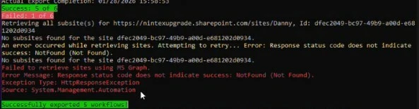 Next it will check if you want to export by a specific site or the entire tenant. Selecting “Y” will allow you to input the specific site to export from, otherwise the script will export all workflows within the tenant.