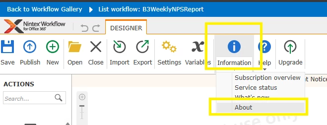 - The workflow designer will now open. Expand the drop-down under "Information" and select "About"