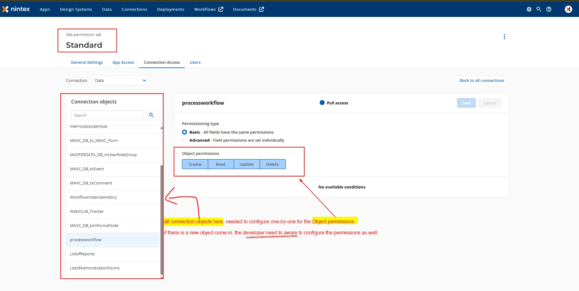 Currently, under Site Settings > Connection Access, I have to manually select every single object and configure the "Object Permissions" (Create, Read, Update, Delete) one by one. This is becoming very tedious as the project grows. If a new object is added, the developer has to manually remember to go back into the Site settings to enable it, or the App fails to pull data.