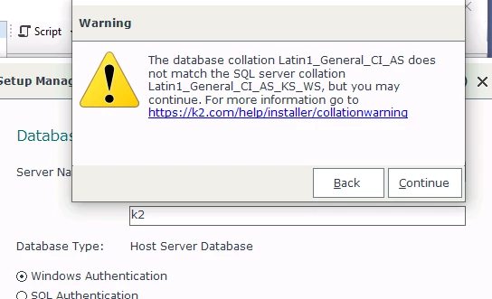 I have a SQL instance with the collation Latin1_General_CI_AS_KS_WS for SharePoint Server SE. Is it possible to install K2 on the same instance by manually creating the K2 databases with the required collation (Latin1_General_CI_AS)? When I try this, I get the following warning message .And when I click 'Continue', I get another message: 'K2 is the wrong type of database'."