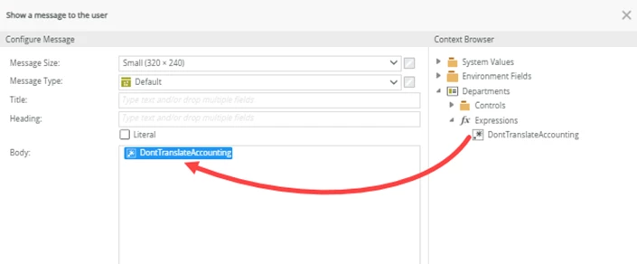 - The message configured with the expression is not translated.