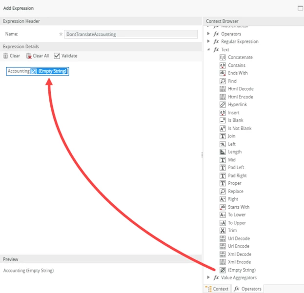 - Enter the word or sentence that should not be translated, then drag Empty String from the context browser to the end of the expression.