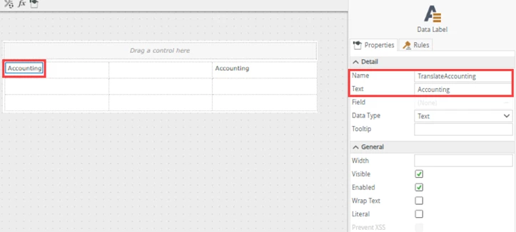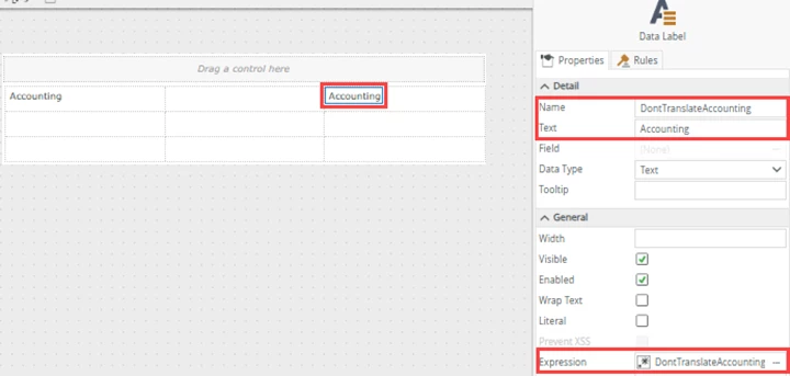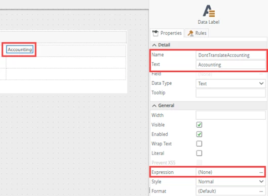 In the example below we have a Data Label control with text that should not be translated.