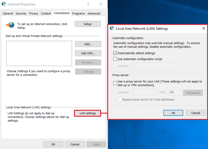 - Uncheck Use a proxy server for your LAN (These settings will not apply to dial-up or VPN connections), if applicable.