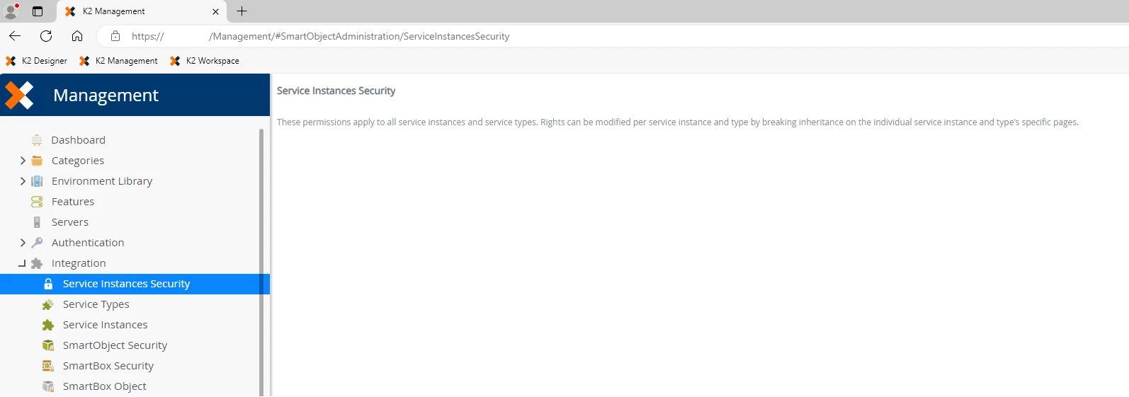 On K2 Management, after going to the Service Instances Security page and setting Deny for Everyone, the permission settings no longer load for that page.