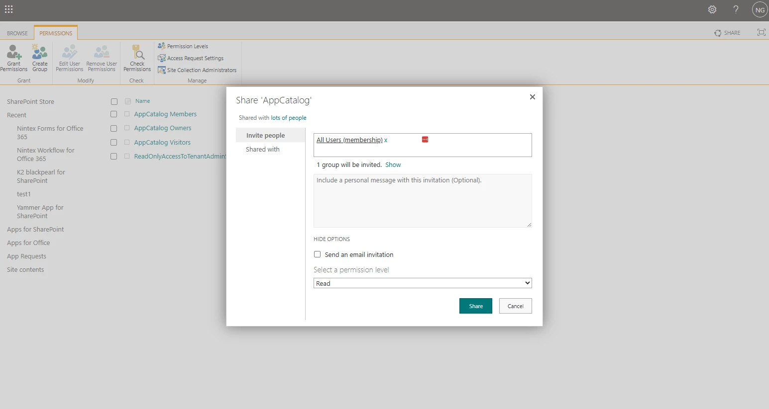 - Navigate to the App Catalog site permissions page at https://[tenantname].sharepoint.com/sites/AppCatalog/_layouts/15/user.aspx