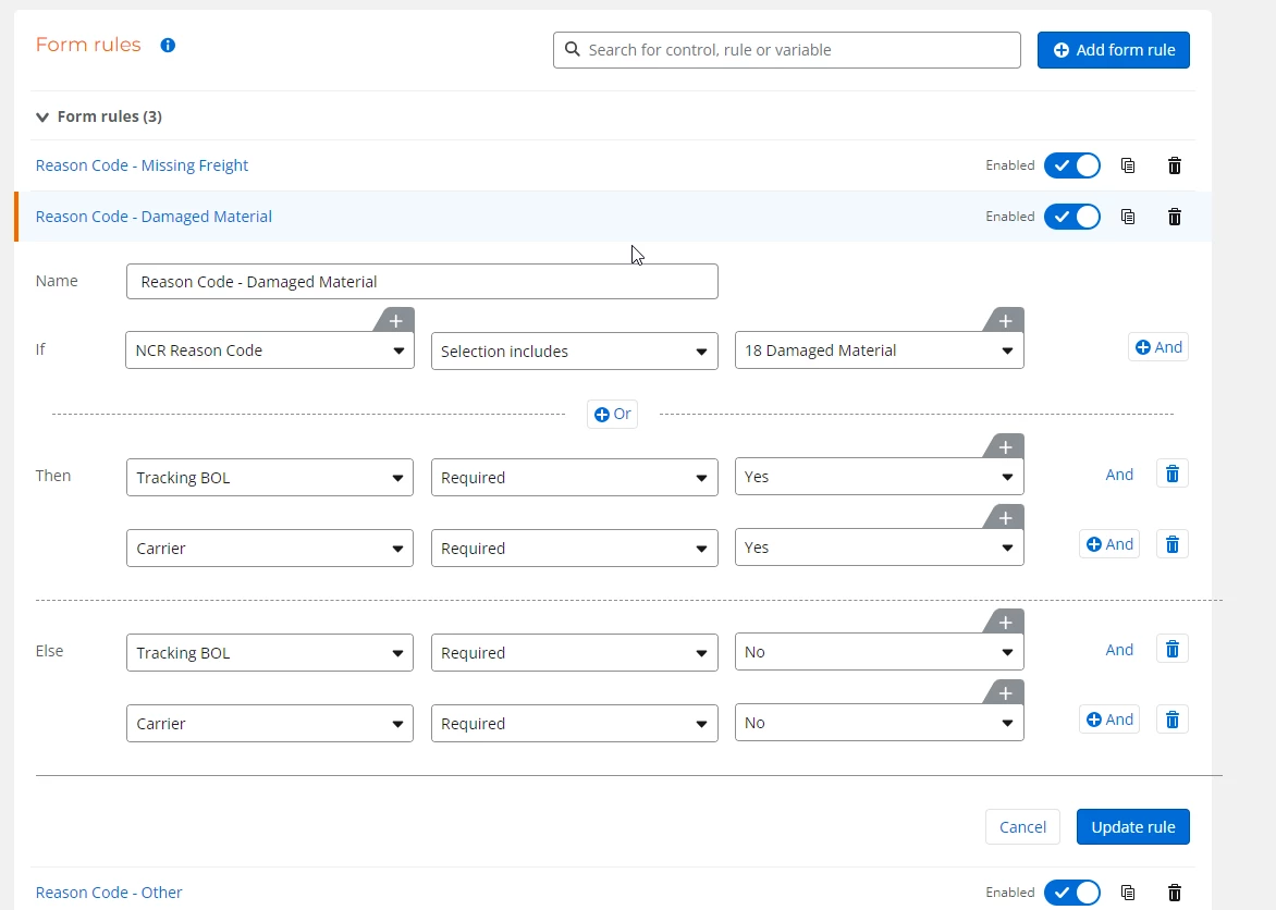 Constructing a rule so that depending on a “reason code” that is selected, 2 additional columns are now required to be filled in. It works just fine for a single selection but if I duplicate the rule and then modify to reflect the 2nd choice, only 1 of the rules will work. For building a single rule, as you see in the attached, you don’t get an option to add an “or” condition….only “and”.
