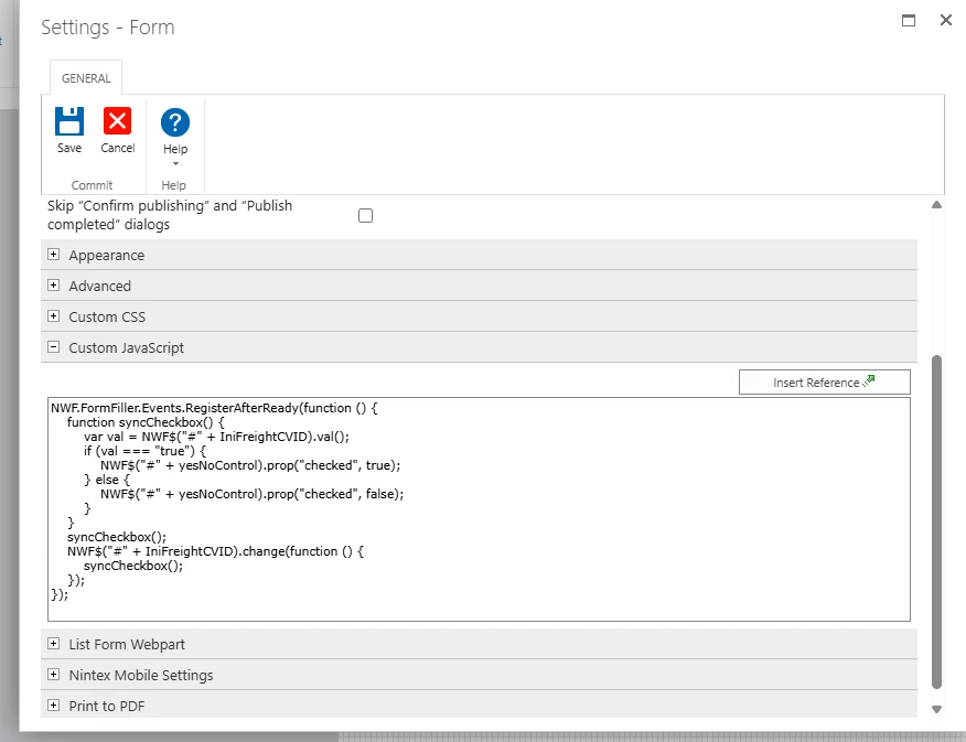 NWF.FormFiller.Events.RegisterAfterReady(function () {var calculatedValueControl = NWF$('#' + MyCVID);calculatedValueControl.on('change', function () {var calculatedResult = NWF.RuntimeFunctions.Get CalculatedValue(MyCVID);var yesNoControl = NWF$('#' + MyYesNoID);if (calculatedResult === true || calculatedResult === 'Yes') {yesNoControl.prop('checked', true);} else {yesNoControl.prop('checked', false);}});