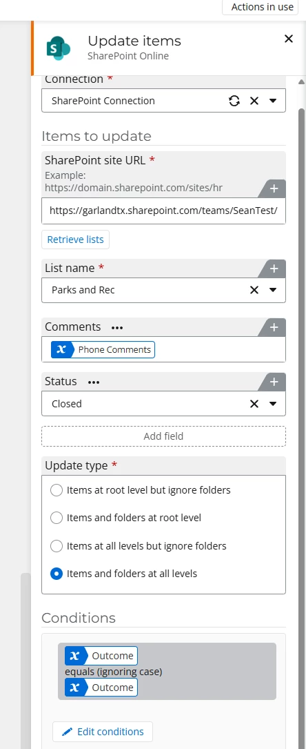 How can I update a SharePoint list item in Nintex based on a outcome of a task (instead of using the SharePoint list item ID) when using the SharePoint “Update item” connection?