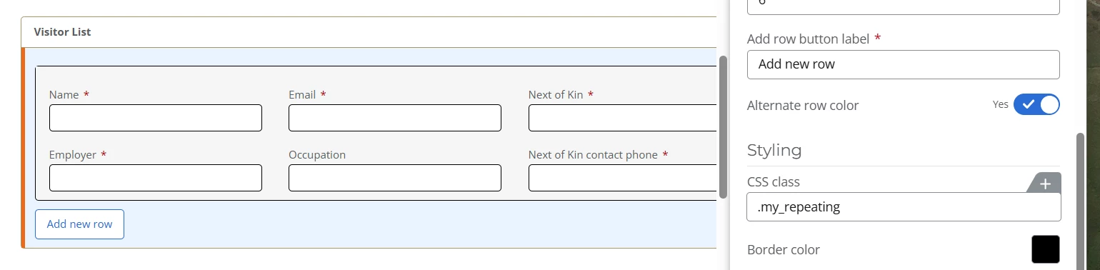 I add the “.my-repeating” to the CSS Class box for the repeating section and internal fields; I’ve also tried using ntx-repeating-section (without the dot) instead of .my-repeating within the Custom CSS but the form seems to ignore any custom CSS for repeating section: