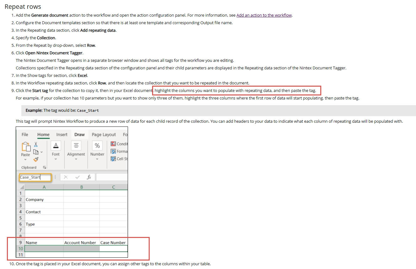 I have a starting form with a repeating section. My goal is to generate an Excel file with the data from the repeating section. When I run the workflow, the Excel file is generated with only one row, corresponding to the data from the first row of the repeating section. How should I proceed to get the other rows? Am I missing a loop? See attach, my template and the generated file.