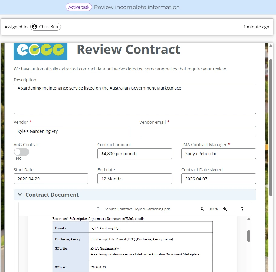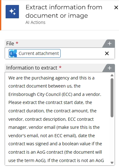 If it is a contract, we then use another AI action to extract contract details such as contract title, the contact details of the 3rd party, contract dates and contract amounts. Here's where AI is really powerful because the data is unstructured. We don't know where in the document this data is stored and what it's called. In the accompanying video the example contract document has a contract title named "SoW for" but AI smart enough to know that is the title. AI can even reformat data at the same time e.g. change a date into dd-mm-yyyy formation. This saves an incredible amount of time.