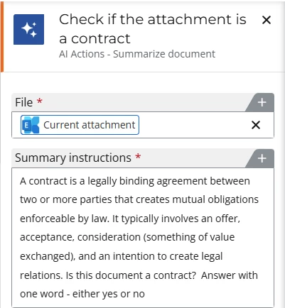Then we need to go through all of the attachments in the email using the get attachment from email action and we use one of our AI actions to figure out if the attachment is a contract.