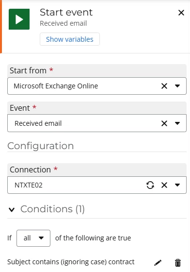 The first thing to consider is how do we receive the document? We could provide a form for someone to upload but also people still love email so in this case, the workflow is started when an email is received and the subject line contains the word "contract".