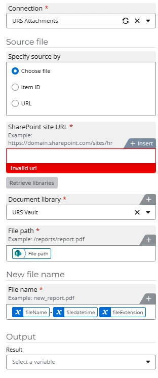At the start event form, I set the file upload, this file will always have a different name (depending on the user) I wonder if there is a way to rename it to one of the variables and save it on the SharePoint folder.