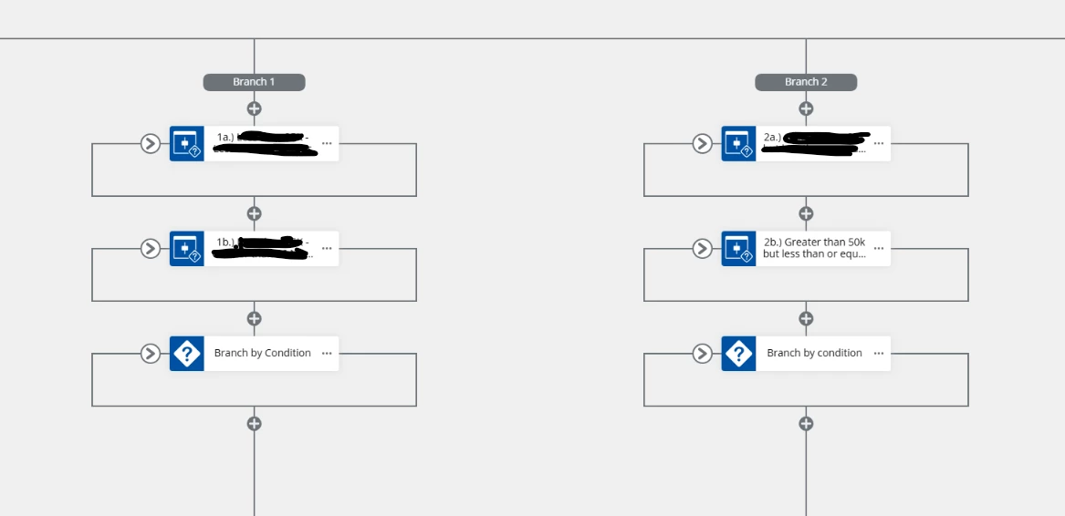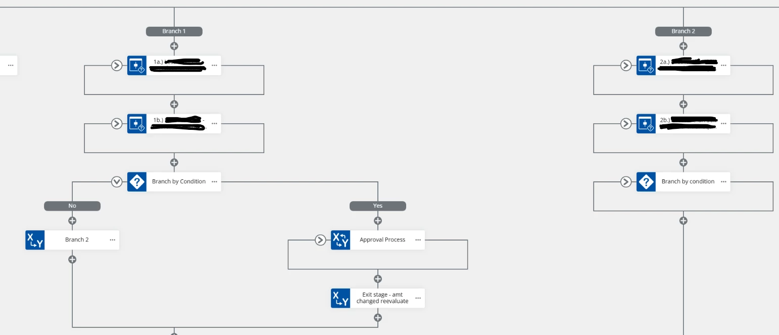 I have a WF built in NAC that uses a Branch by stage action depending on 3 conditions. Under each branch I have condition actions looking for an amount, how many months and if a field is “ticked” to yes or no (boolean).