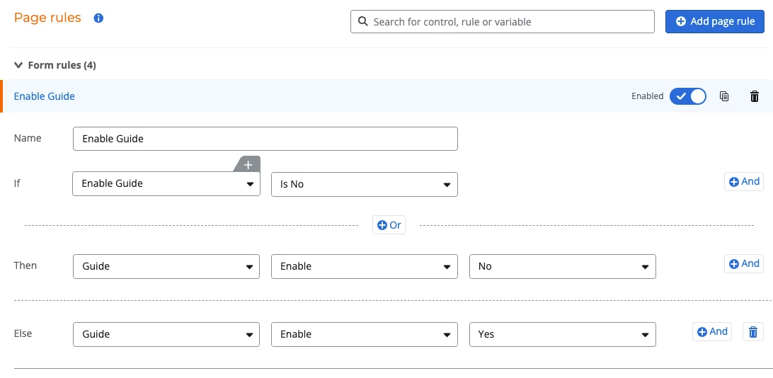 This option allows pages to be enabled or disabled based on user input. This functionality is achieved by using the new page rules feature.