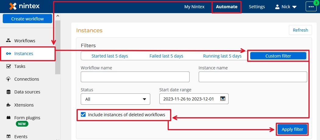 1. In Nintex Automation Cloud, navigate to Automation > Instances > Customer Filter