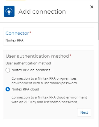 - On the User Authentication Method page Choose the Nintex RPA Cloud