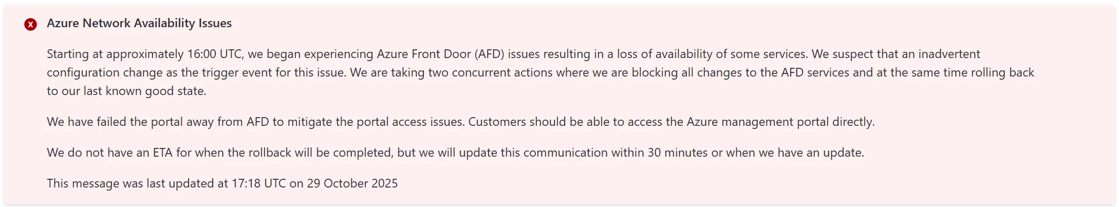 There is currently an ongoing outage for Process Manager (as of 29-Oct-2025 16:00 UTC). Normally we post our system status on https://status.nintex.com/, however, this particular outage relates to an ongoing Azure Front Door service outage (Azure status), which is also impacting our ability to update our Nintex Status site.