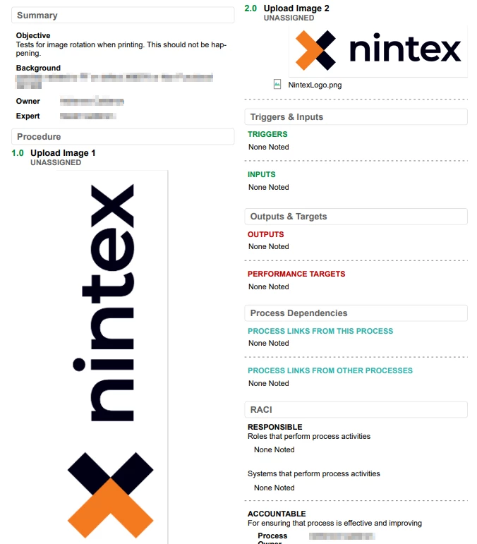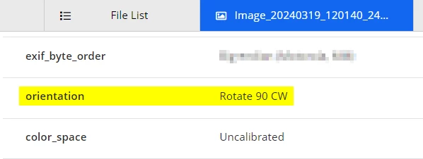 Users may notice that an image within a process displays correctly when viewed in a browser but becomes rotated when printed or saved as a PDF. The root cause of this problem lies in the image's metadata, which indicates a different orientation from what is visually displayed.