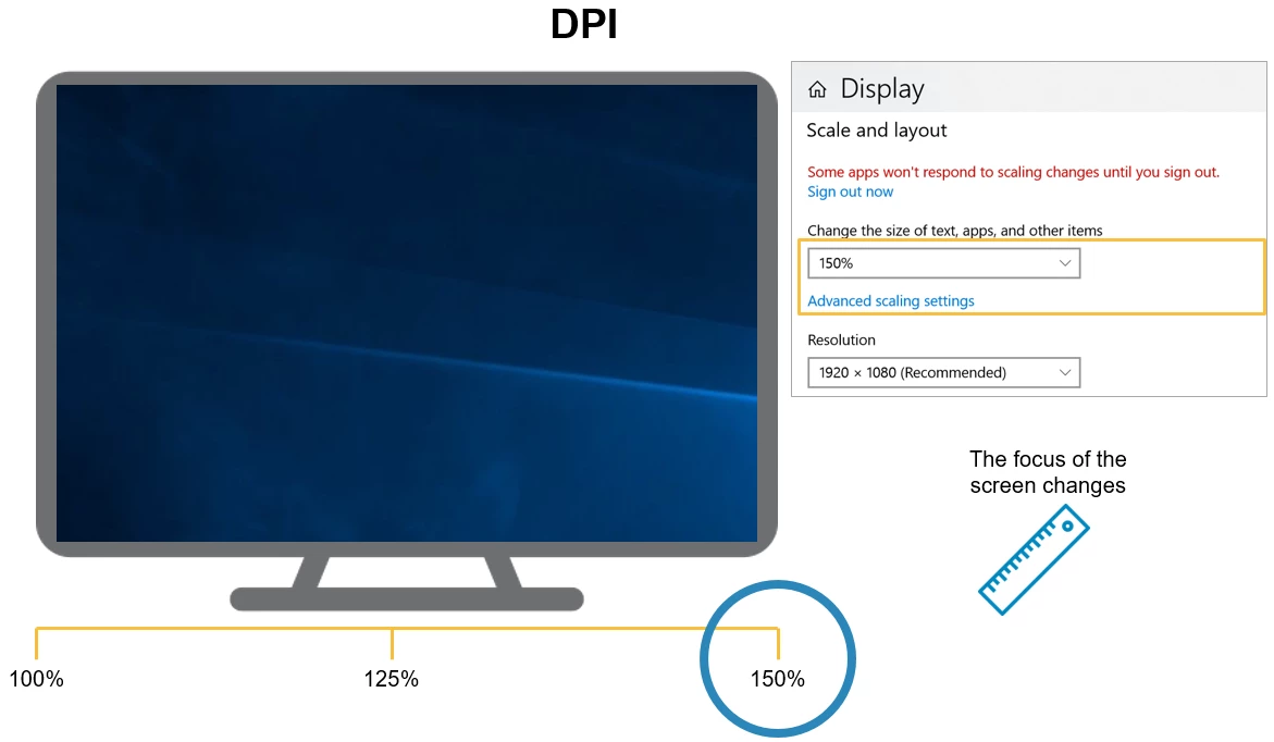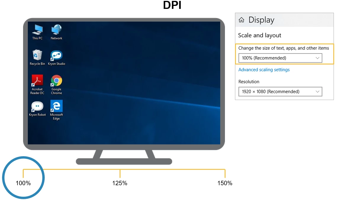When it comes to Visual steps in wizard regardless if entirely visual-based workflows or recordings related to HTML-related commands there are two very important factors to consider: Resolution and Scaling of the recorded display. The default resolution and scaling settings are 1920x1080 and 100% respectively. Why would this matter and what issues you might run into in the long run? To put things simple, the higher the resolution the bigger the canvas the Wizard will be able to recognize objects on. The higher the scaling, the bigger PPI (pixel per inch) there will be to recognize objects.