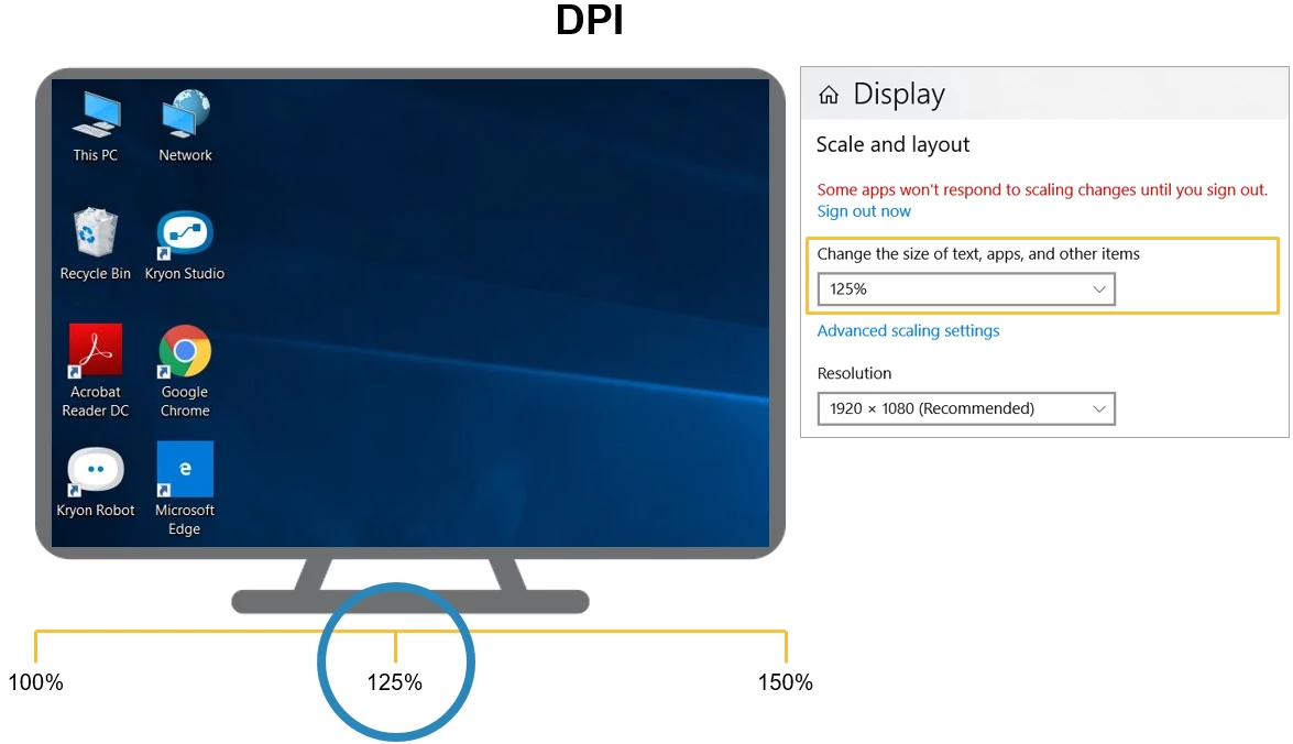 The main point of understanding this particular part of the object detection is to get an understanding of how the recognition works and what it depends on. In short, if the Wizard in the Nintex RPA Studio has been recorded on a machine with a resolution of 1920x1080 with a DPI setting of 100% (default values) but the Nintex RPA Robot is running on a resolution of 800x600 the DPI settings will not be relevant in this case as the canvas will not be same and the Robot will only "see" only a small part if it.