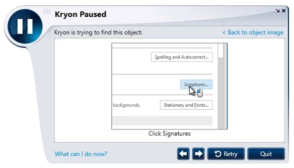 | Incorrect object detected | The visual detection settings are incorrect, or the image that was selected in the Position tab's Object Image area does not match the image that appears on the user's screen | Choose a different image from the Object Image area, and/or change the settings in the Position dropdown list |