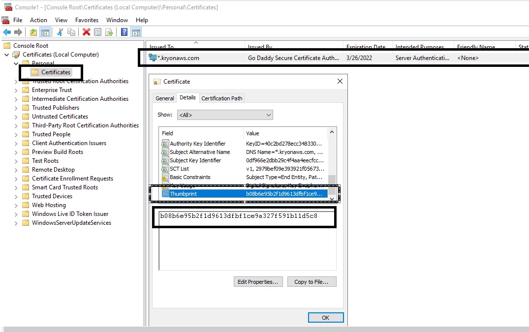 2. Using Computer Management (MMC), get the thumbprint of the installed certificate.