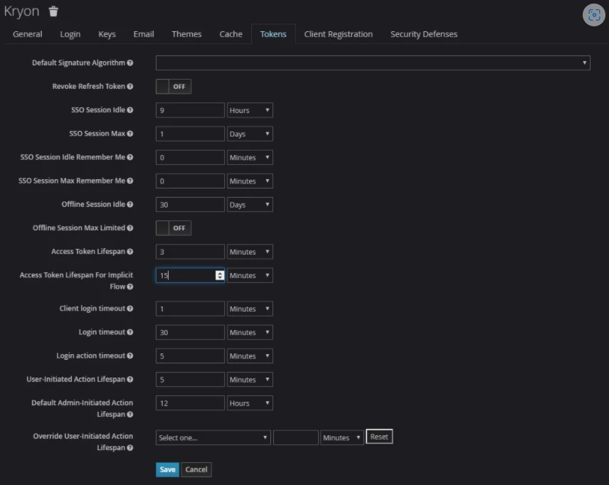 - Locate the “Access Token Lifespan for Implicit” field and select the most appropriate method and time.