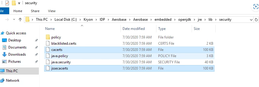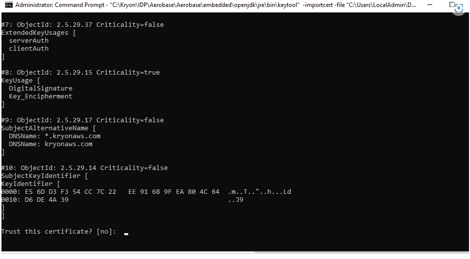 Import the certificate to the jsseCAcerts keystore using the following command: "C:\Nintex\IDP\Aerobase\Aerobase\embedded\openjdk\jre\bin\keytool" -importcert -file "C:\Users\LocalAdmin\Desktop\KryonCert.cer" -alias Kryon14-126.kryonaws.com -keystore "C:\Nintex\IDP\Aerobase\Aerobase\embedded\openjdk\jre\lib\security\jssecacerts" -storepass changeit NOTE: The command needs to run as Administrator, and the Certificate must be a valid X.509 (.CER) file.