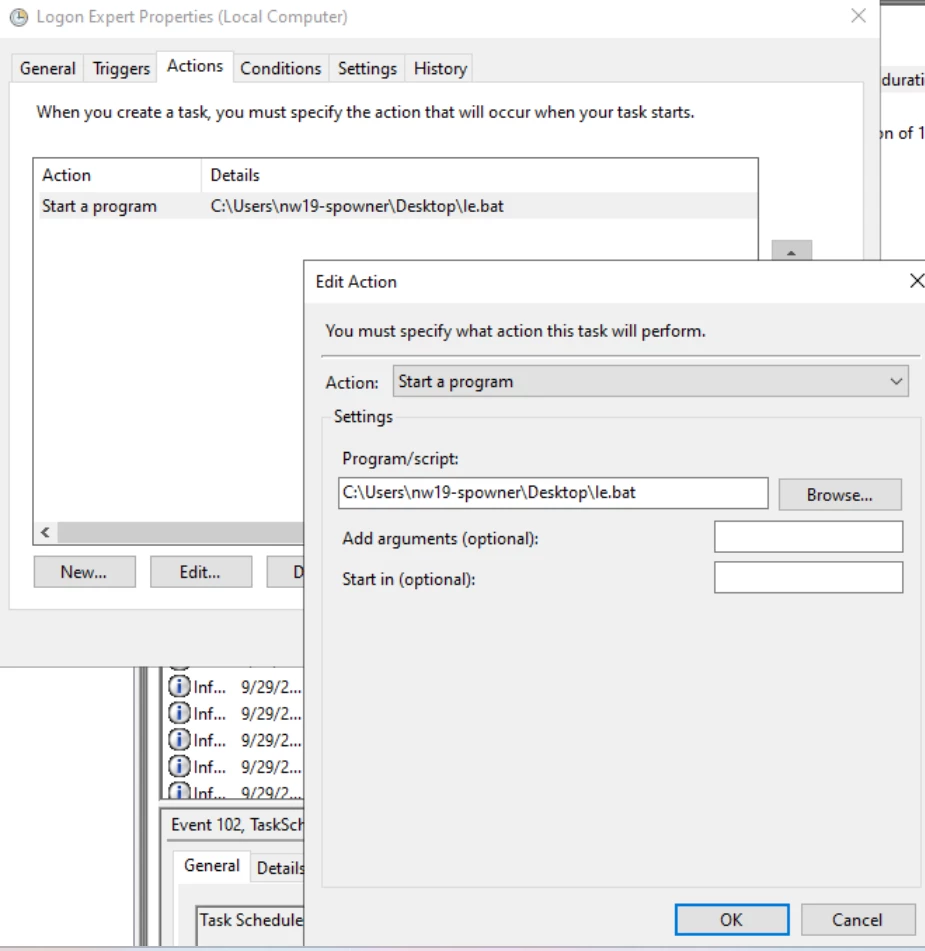 4. Create a task scheduler that runs the le.bat to set the credentials periodically. Run the task manually to test it, and monitor the logon.ini file if the credentials have been set.