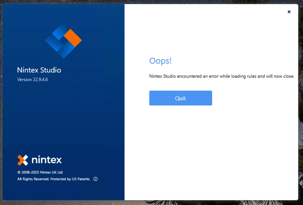 “Nintex Studio encountered an error while loading rules and will now close.”