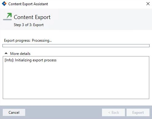The following article will include instructions on how to check and possibly resolve the behavior when attempting to export a wizard from the Nintex RPA Studio, Content Export is stuck on the "Processing..." phase.
