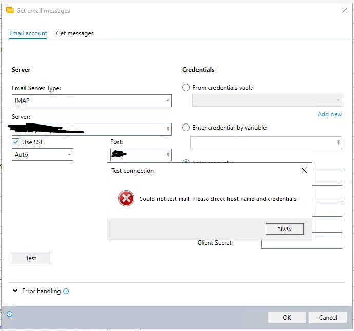 The credentials are correct, I can send emails, and it works as "get email trigger" in the console.