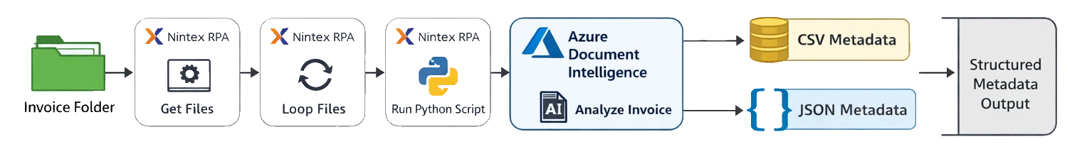 With Nintex RPA, Python, and Azure Document Intelligence, we can build an intelligent document processing (IDP) pipeline that automatically extracts invoice metadata and converts it into structured formats such as CSV and JSON.