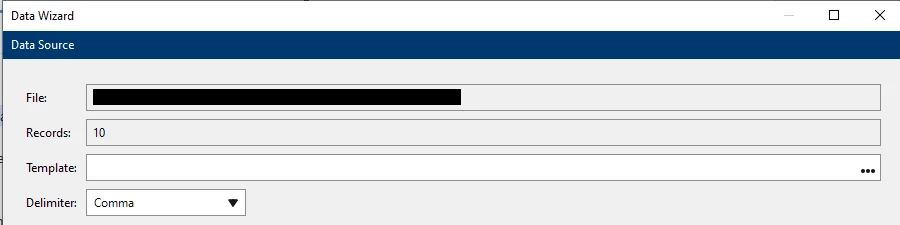 - On the Data Source screen shown below (in RPA LE, it will say Data Source), change the delimiter or any of the other fields, but don't choose a template in the template box.