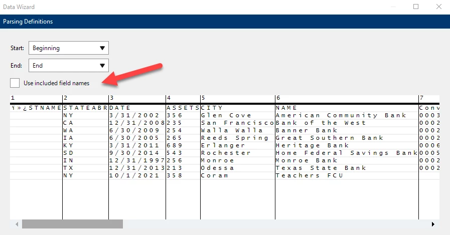 - On the Parsing Definitions page, check 'Use the included field names' or leave uncheck as desired. If any of the columns are clicked, they will be grayed out which means they will be ignored
