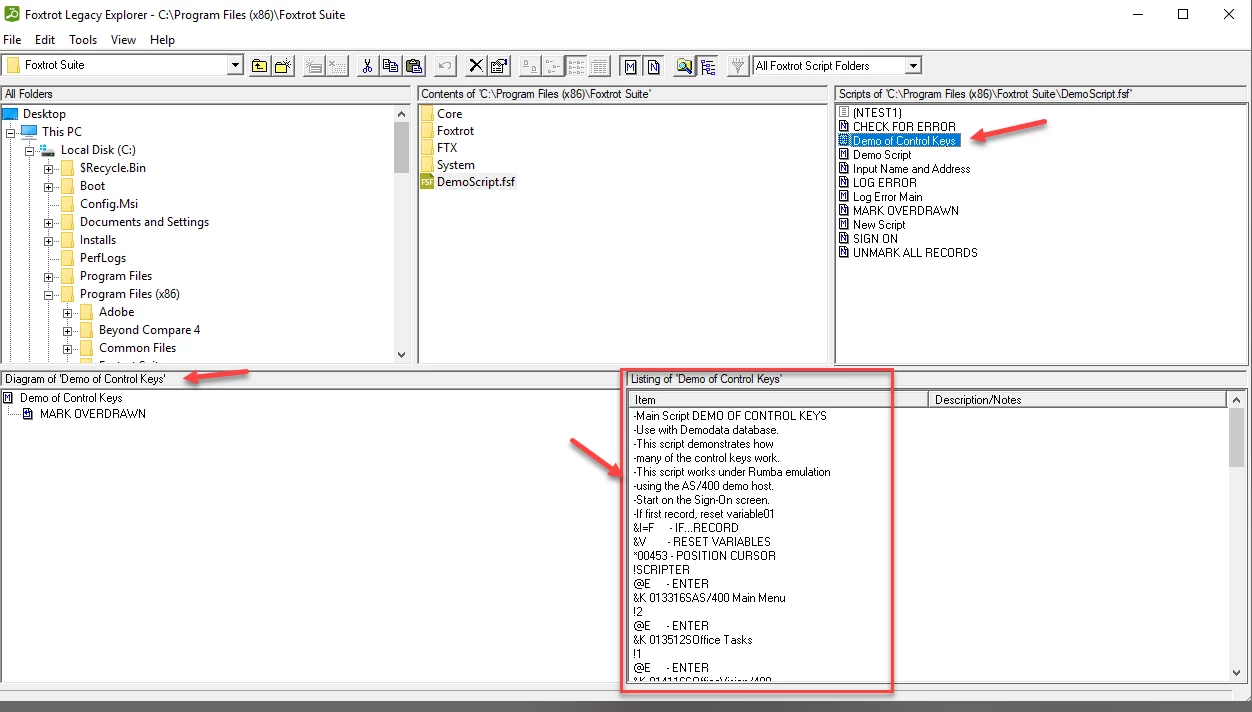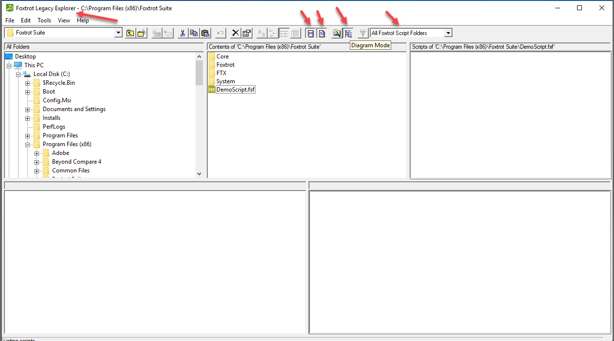2) In Foxtrot Legacy Explorer' tool, be sure to click the toolbar buttons for 'View Main Scripts' (M), 'View Next Scripts' (N), 'Diagram Mode'.And combo box should show 'All Foxtrot Script Folders'.