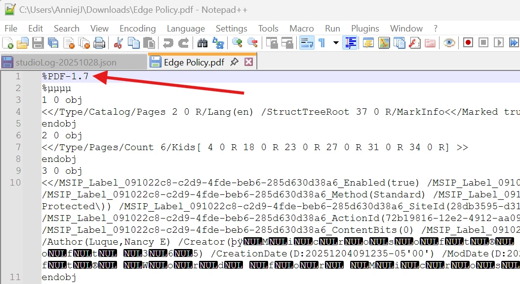 It will be at the top like: %PDF-2.0 (or %PDF-1.7, %PDF-1.6, etc.)