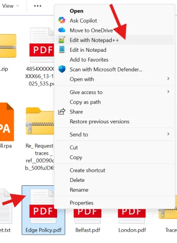 - Right-click the PDF file → Select Open with → Choose Notepad (or Notepad++)