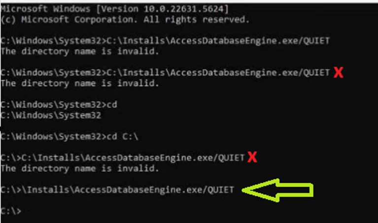 Run the command: C:\Installs\AccessDatabaseEngine.exe /QUIET