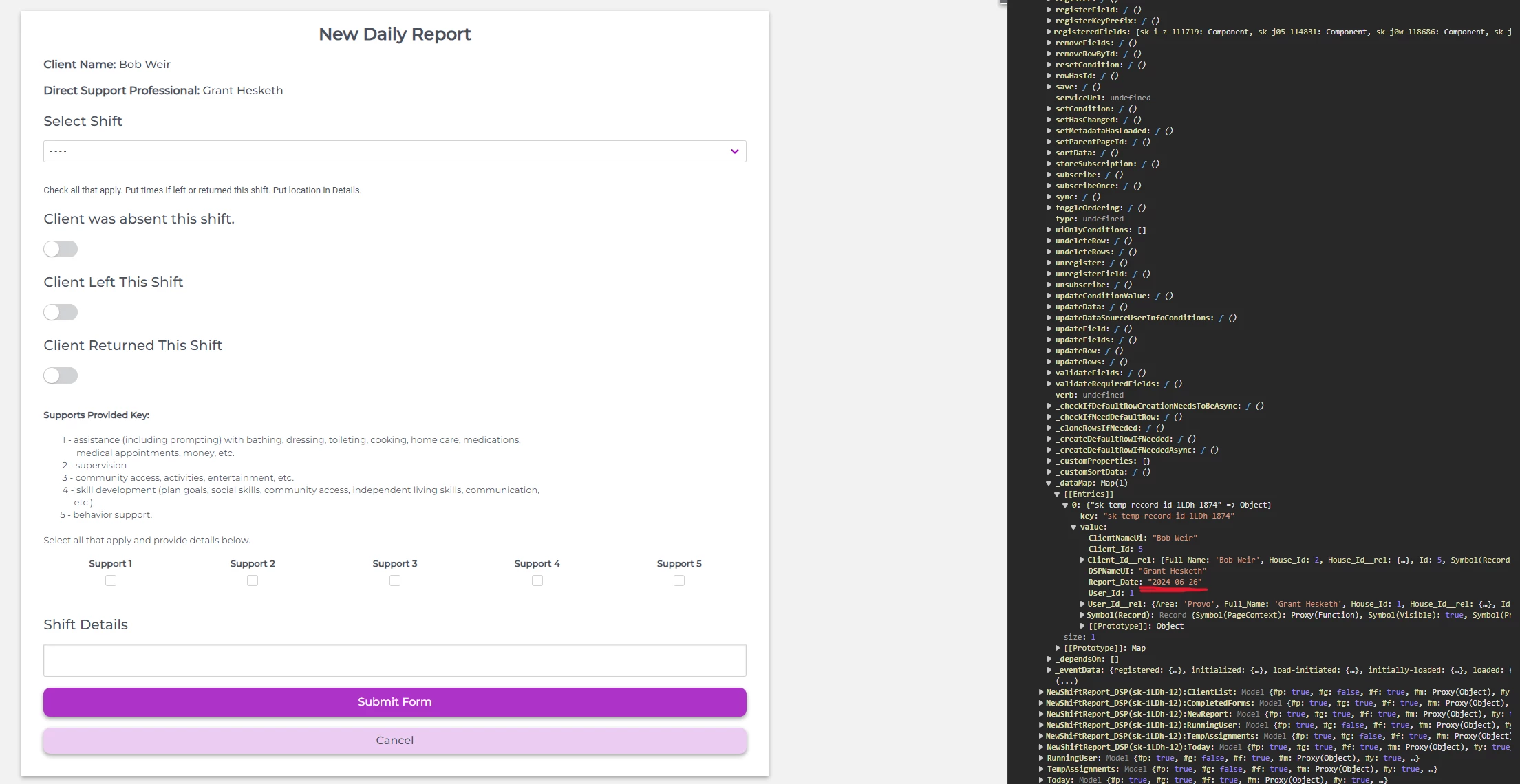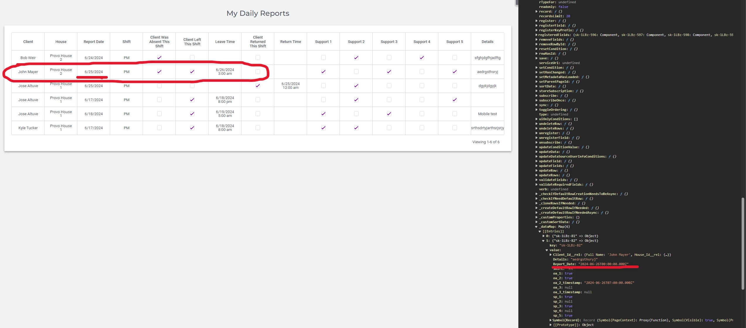 I am using NLX on version Edinburgh Update 6 (16.7.1.0) connected to a Microsoft SQL database. The field I am having issues with is built as a DATE (not datetime) field in the database and the schema in Skuid reflects that. When I create a record and set the date (using a TODAY function) it looks correct in the console where it is just todays date only (6/26/24). It also is correct in the DB when just doing a SQL query. The problem arises when I load that record back into NLX it displays in the console as 2024-06-26T00:00:00.000Z and then displays the date on the table as the day prior (6/25/24). This is affecting some logic as well as its just not the correct display. I have attached screenshots as well. Any help would be great, I don’t know why its loading it as a datetime when its Date only in both DB and Schema and I also don’t know why that’s getting displayed as the day before. (Screenshot Reference – 1)Form – original record creation 2) screenshot from db sql query showing raw data 3) reload of data into a table)