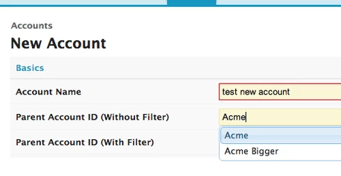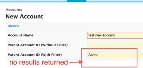 Below is a sample page that demonstrates the issue. The field “Parent Account (Without Filter)” has no filter applied while “Parent Account (With Filter)” has a filter “Id” not equal to field from current row “Id”