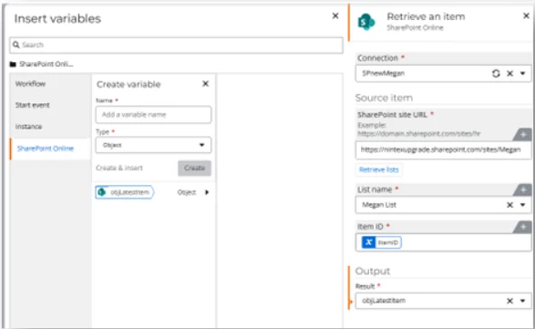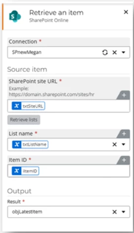Select the connection and fill in the SharePoint site URL. Click Retrieve lists and select the list name you would like to retrieve from. Insert iItemID (the variable we created) into the Item ID field. Create an object variable for the Retrieve an item output. Remember to make use of the hard-coded values for the site URL and list name first so that the object can gain context of the list columns.