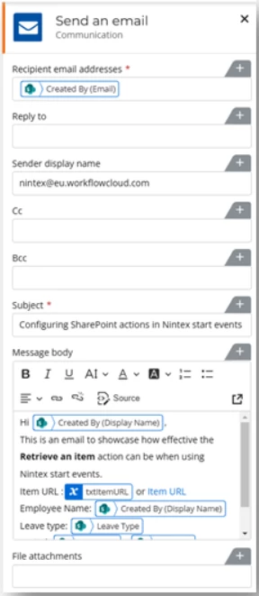 Populate the Recipients, Subject, and Body fields. This example demonstrates the power of the "Retrieve an item" action by using SharePoint variables from its output alongside the txtItemURL start variable, both directly and as a link.