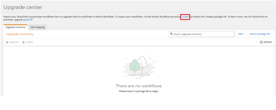 The first step in upgrading workflows from On Prem into Nintex Workflow is to acquire the Nintex Extraction Scripts. These can be found by clicking the word script on the Upgrade Center page in your Nintex Workflow tenant. If you don’t see the Upgrade Center in your tenant, please refer to the above article for how to activate the tooling in the tenant.