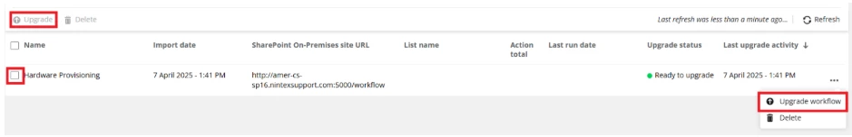 To initiate the upgrade of the workflow (once it is populated in the Upgrade Center), click the ellipses to the right of the workflow and select Upgrade Workflow. Workflows can also be upgraded in bulk by clicking the toggle box to the left of the workflow names and selecting upgrade from the ribbon.