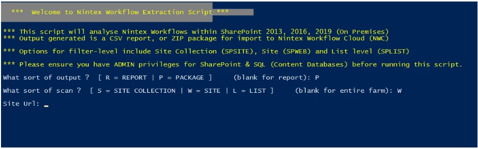 The downloaded script should be run on a Web Front End server in your SharePoint farm. Be prepared to specify the Scope to extract, the URL for that scope, and Output directory when running the strict. Make sure the scope includes fewer than 500 workflows as this is the limit allowed for a single extraction package. Also make sure when specifying the scope URL to exclude trailing slashes.